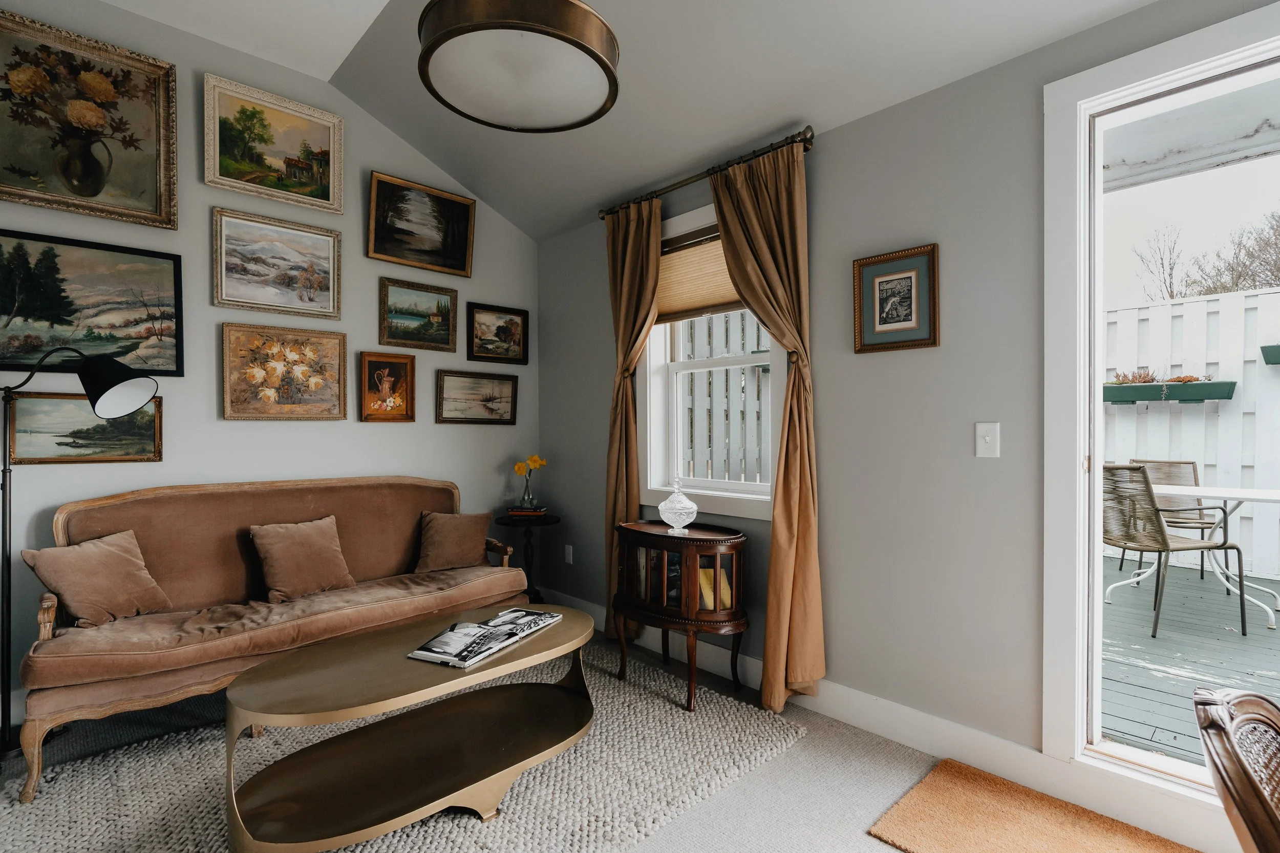 Our 3rd floor Roof Top Deck Suite is one of our largest rooms within the inn and includes a king size bed featuring Sferra linens, an en-suite bathroom complete with a soaking tub and Zenology bath amenities. This room offers a private outdoor deck with a view of Kenoza Lake and a separate living room, offering the perfect place to escape and unwind.